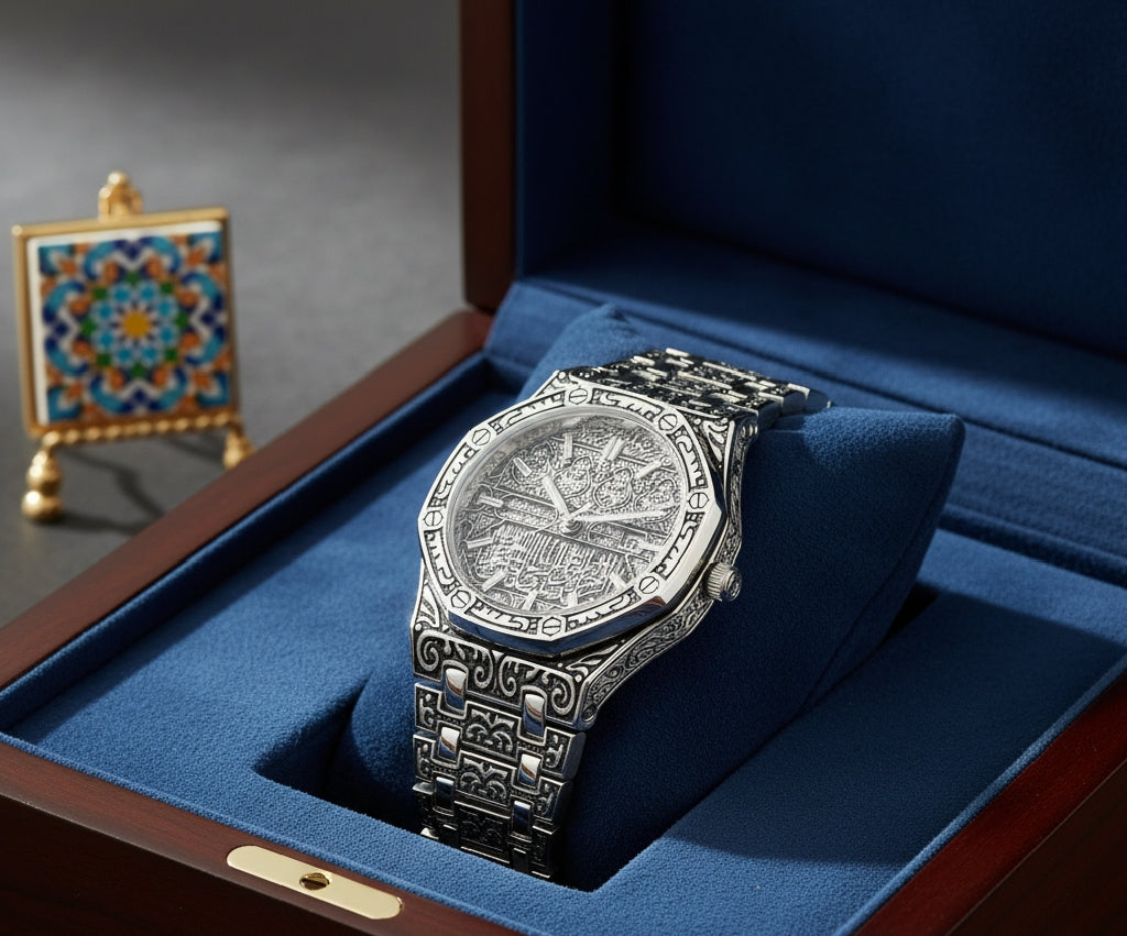Celebrate tradition and modern design with this Islamic engraved wristwatch. The intricate Arabic inscriptions bring spiritual artistry to life, while the stainless steel construction ensures durability and strength. Featuring a polished bezel, luminous hands, and a comfortable bracelet, this ONOLA timepiece is a true reflection of heritage meets luxury.